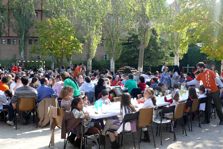 El lugar elegido fue el Centro Labouré (Fundación Sotes), cuyas responsables nos habían cedido generosamente sus amplias instalaciones y así fue como nos pudimos juntar casi 300 personas cómodamente para comer juntos y pasar un día estupendo. La meterología nos acompañó con un día soleado y una temperatura agradable lo que facilitó también compartir y embarrarnos en una apuesta por la solidaridad.